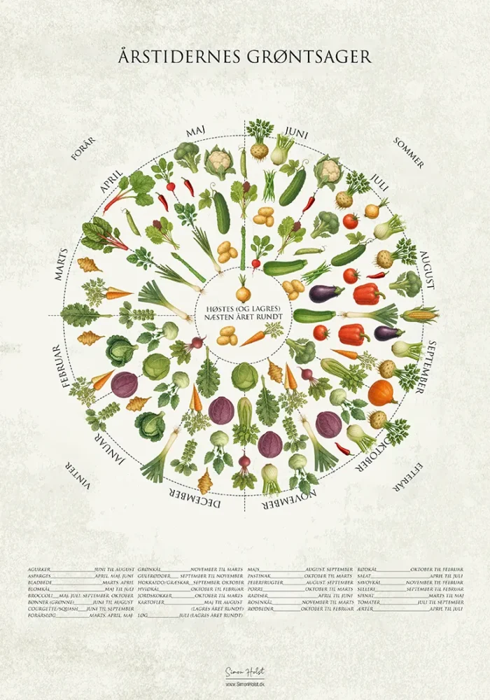 For at få en komplet guide til sæsonens fødevarer kan du også se vores “Årstidernes frugter” plakat. Sammen giver de en fuldkommen vejledning i, hvordan du kan spise efter sæson året rundt. Derudover tilbyder vi også plakater for sæsonens fisk og skaldyr, så du kan få inspiration til alle dele af din kost.