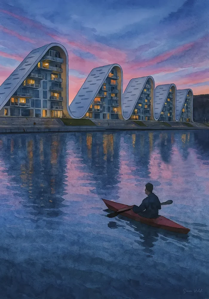 Plakatens akvarelstil indfanger farvespillet mellem himlens nuancer og fjordens rolige vand. Bølgen ligger placeret langs havnefronten og afspejler sig i fjorden. Denne stemning gør, at plakaten ikke kun er en Bølgen i Vejle Plakat, men også en atmosfærisk Vejle Plakat, som fremhæver samspillet mellem natur og arkitektur.