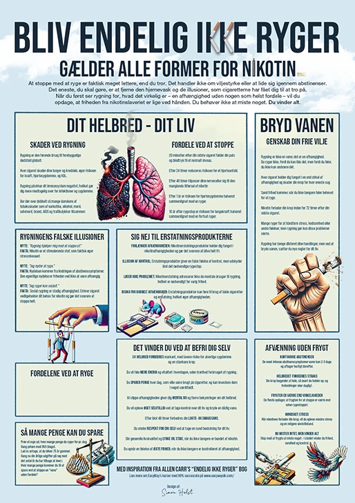 Plakaten er udviklet med inspiration fra Allen Carr’s rygestopmetode, som er anerkendt verden over for sin høje succesrate. Sammen med Easy Way (besøg deres hjemmeside her: Easy Way DK) giver vi dig et redskab, der hjælper dig med at tage kontrollen tilbage – én dag ad gangen.