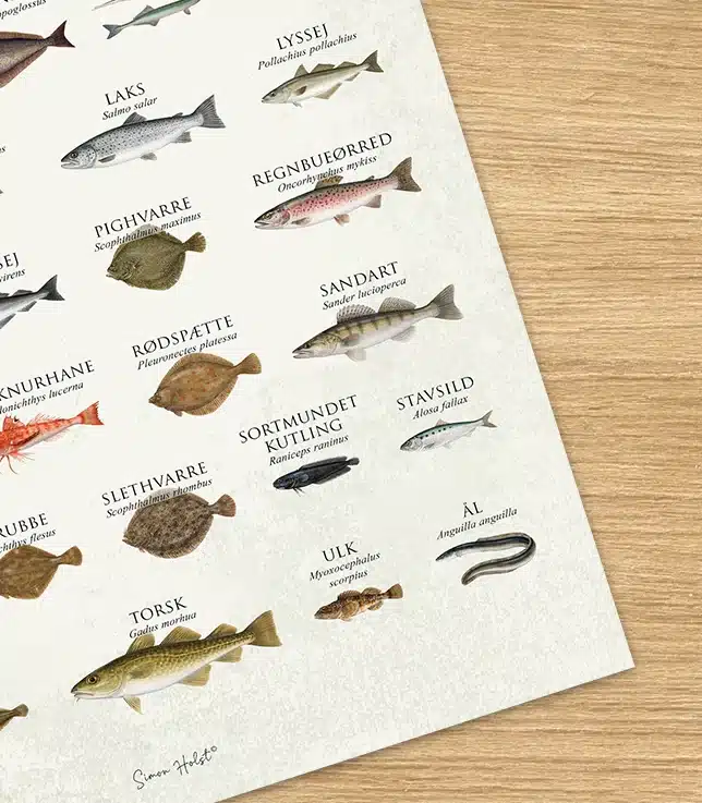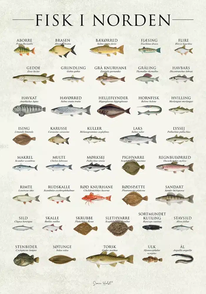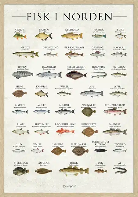 39 nordiske fiskearter. Ét ikonisk plakat. Fisk i Norden plakat er den ultimative guide til Nordens farvande – omhyggeligt illustreret med navn og latinsk artsbetegnelse. Trykt på FSC-certificeret papir i høj kvalitet. Perfekt til køkkenet, stuen eller som gave til fiskeentusiaster.