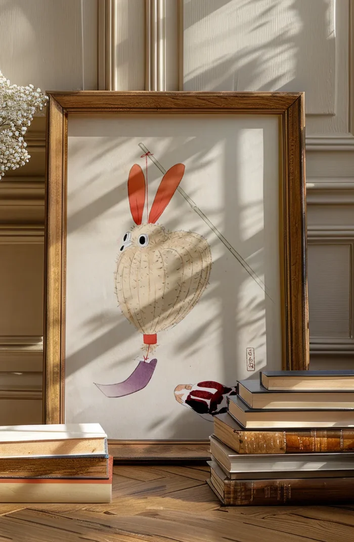 Denne Kyosen plakat fungerer smukt i både stuen, entreen eller som en rolig og eventyrlig vægudsmykning i et børneværelse. Illustrationens legende udtryk kombineret med japansk præcision gør den både kulturelt interessant og visuelt betagende.