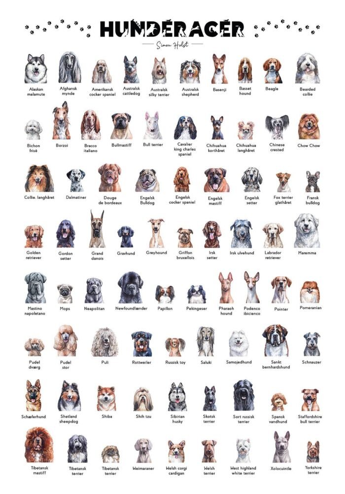 Vores plakat indeholder detaljerede illustrationer af en bred vifte af hunderacer, fra den lille Chihuahua til den store Sankt Bernhard. Hver hunderace er ledsaget af navnet, hvilket gør det nemt for børn at lære og genkende forskellige hunderacer.
