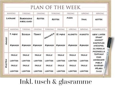 Plan of the week sælges med valgfri ramme i akrylglas og med whiteboard tusch. Når ugen er omme, og en ny uge oprinder, kan du blot viske tavlen ren med en fiberklud, og starte forfra.