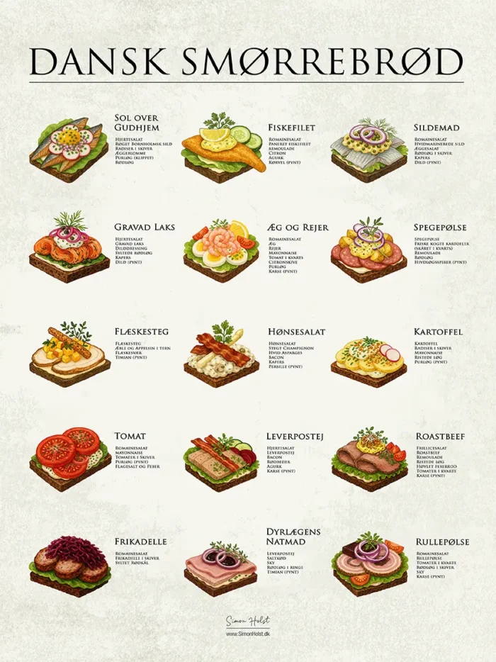 Gør dit køkken levende med vores eksklusive smørrebrød plakat, der illustrerer 16 klassiske danske smørrebrødsmadder – hver med en detaljeret gengivelse og oversigt over ingredienserne. Den perfekte kombination af design, humor og tradition.