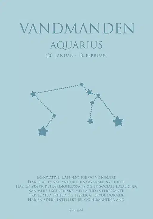 Vandmanden (20. januar – 18. februar) er et kreativt og nytænkende stjernetegn, kendt for sin uafhængighed, opfindsomhed og progressive tankegang. Med en Vandmanden stjernetegn plakat kan du bringe en innovativ og inspirerende atmosfære ind i dit hjem, der afspejler din unikke personlighed og originale sind.